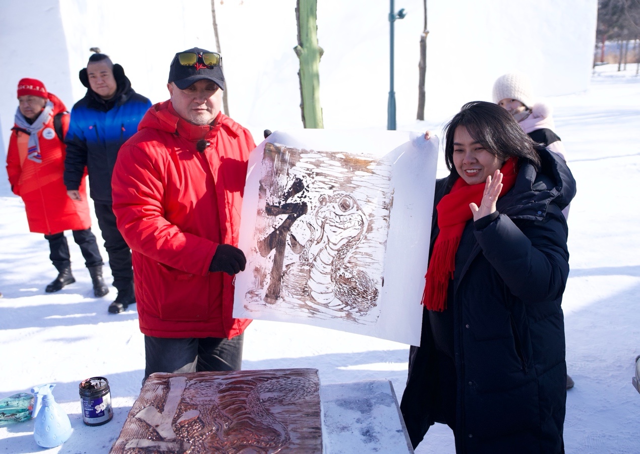 泰國駐華大使館二等秘書王安安在黑龍江省藝術(shù)研究院冰版畫研究院副院長盛琰的指導(dǎo)下,制作出冰版畫《畫蛇添?!罚蒙叩男螤詈蜐h字的偏旁部首組合雕刻出漢字“?!辈⑼赜〕鰜?,寄托對(duì)中國農(nóng)歷蛇年的祝福。