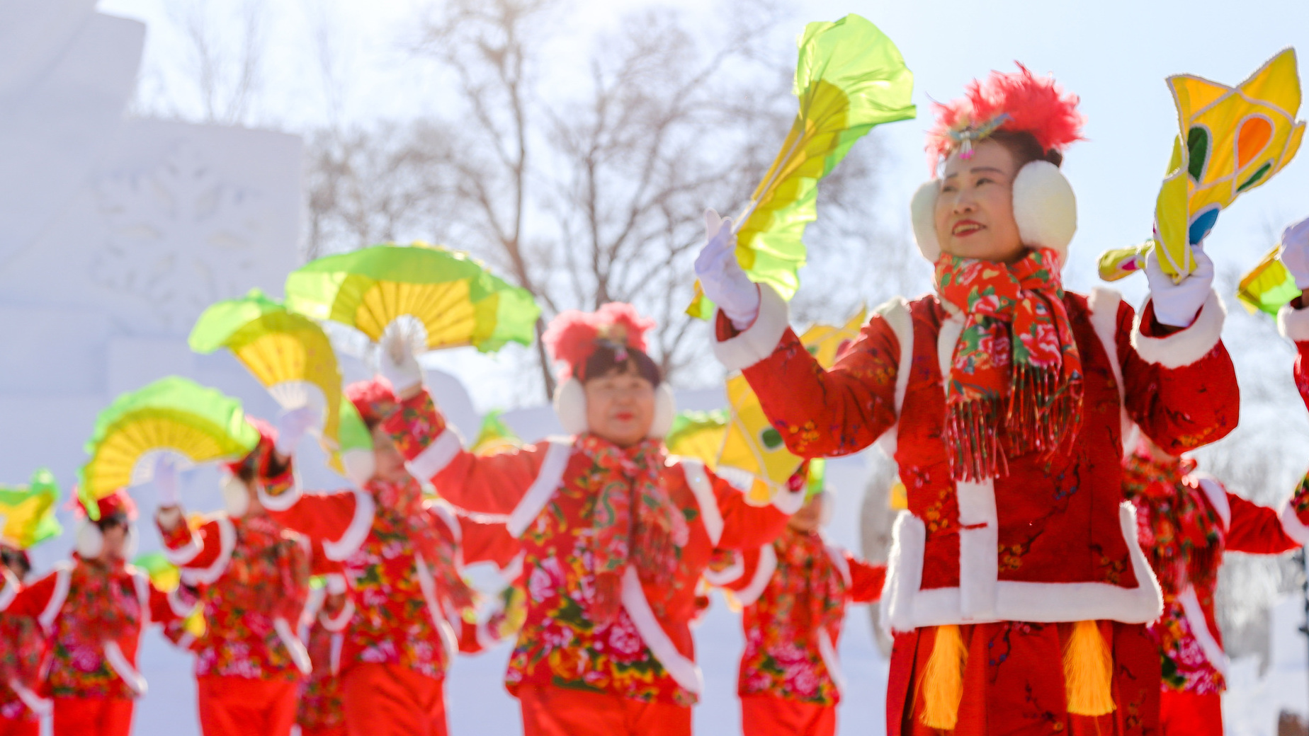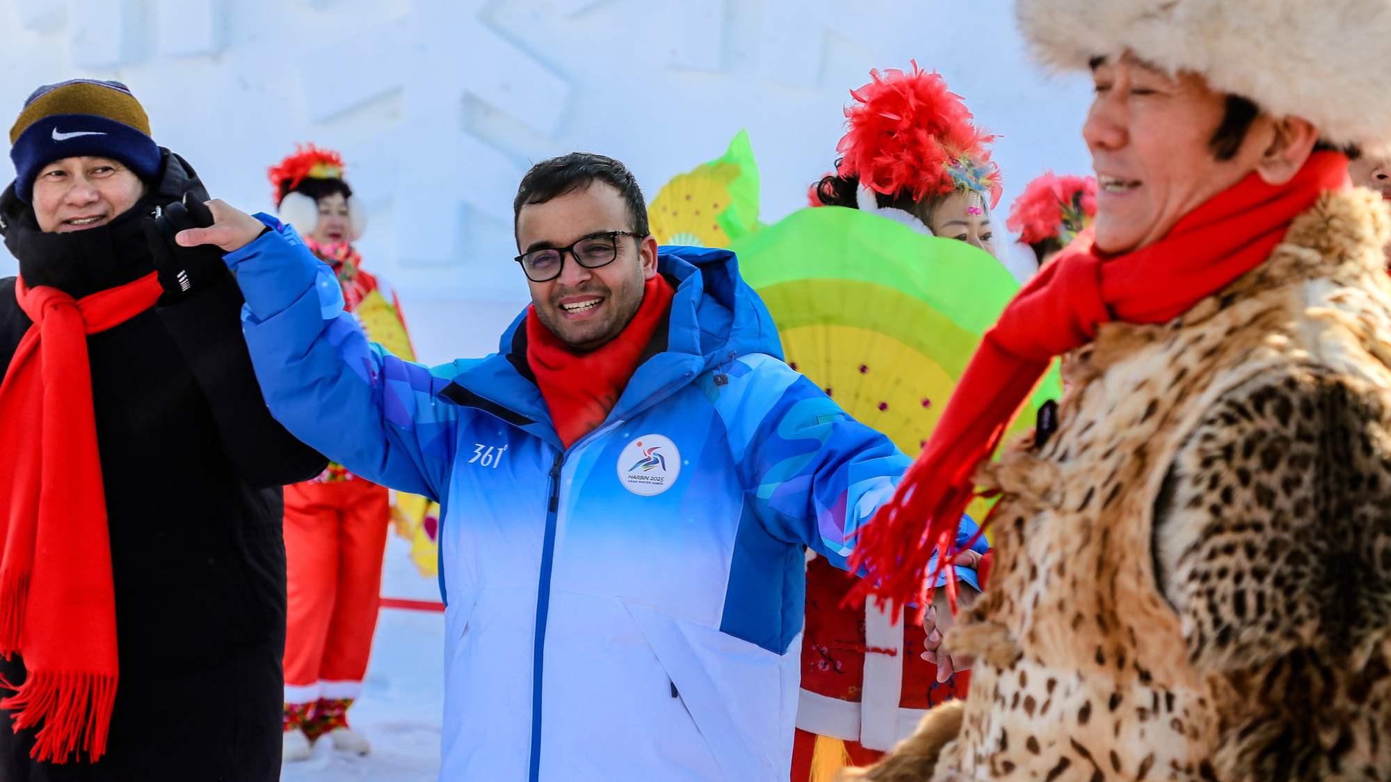 第九屆亞冬會(huì)在哈爾濱舉辦期間,一場主題為“當(dāng)亞冬會(huì)遇上非遺年——亞洲多國人士冰城同慶新春”的人文交流活動(dòng)在哈爾濱舉行?;顒?dòng)當(dāng)天,在哈爾濱雪博會(huì)中央廣播電視總臺(tái)演播室前的廣場上,20多人組成的民間秧歌隊(duì)在哈爾濱中央大街形象大使甲繼海的帶領(lǐng)下,為各國來賓激情演繹迎賓秧歌舞。