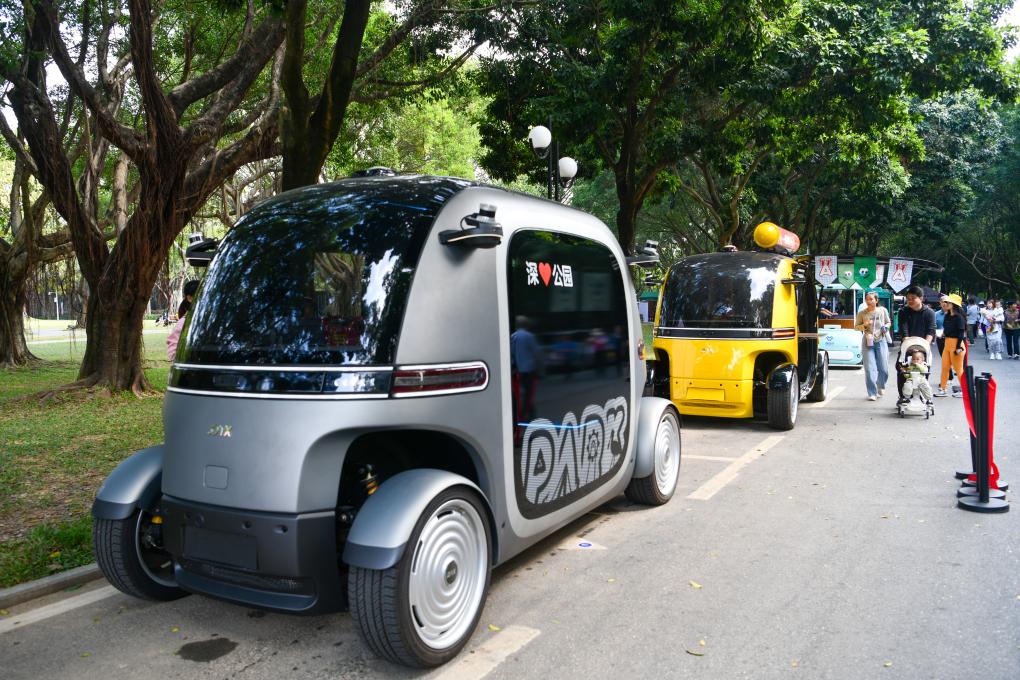 這是2024年11月11日在深圳蓮花山公園拍攝的無人駕駛觀光車、零售車。新華社記者 梁旭 攝