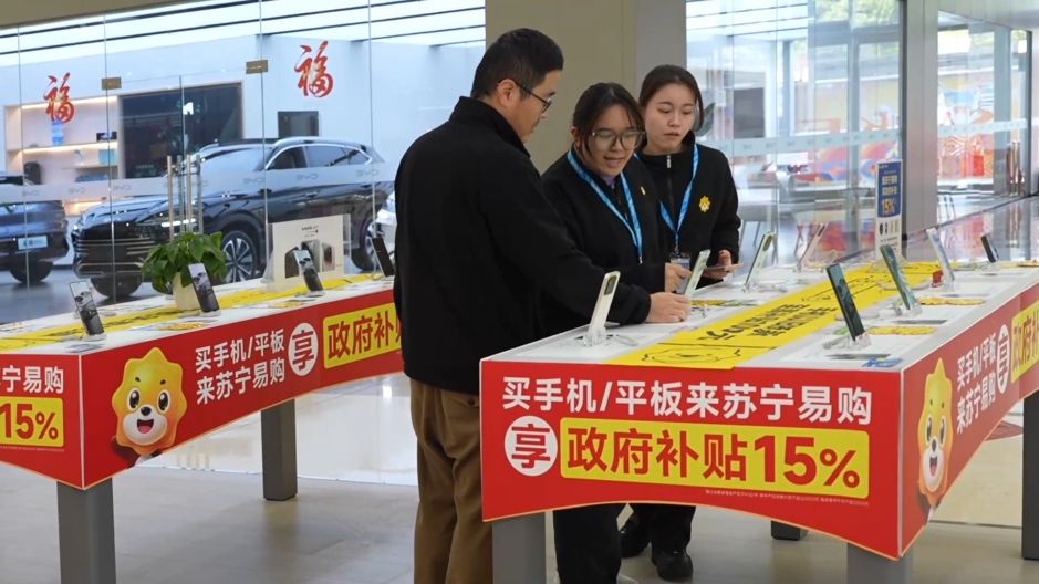 消費(fèi)者在蘇寧易購(gòu)廣西三祺廣場(chǎng)店選購(gòu)電子產(chǎn)品。(視頻截圖)