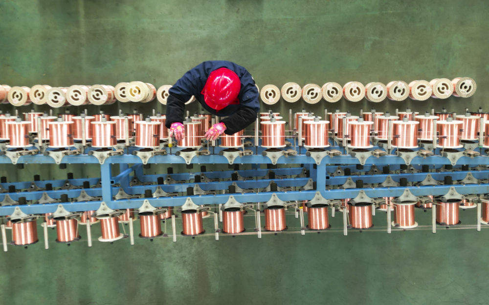 2月13日,在山東省東營(yíng)市廣饒縣李鵲鎮(zhèn)的一家電纜公司的生產(chǎn)車間內(nèi),工人在進(jìn)行束絲作業(yè)(無人機(jī)照片)。新華社發(fā)(劉云杰攝)