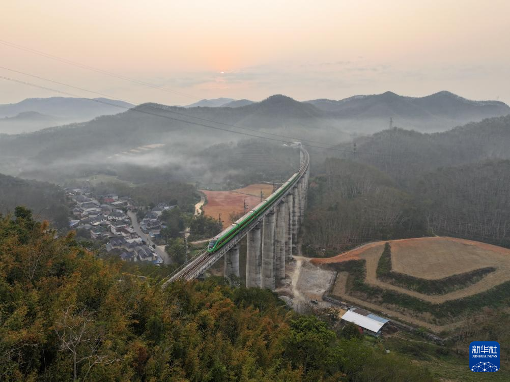 圖為2月22日,動(dòng)車組列車行駛在云南省景洪市境內(nèi)的中老鐵路上(無人機(jī)照片)。