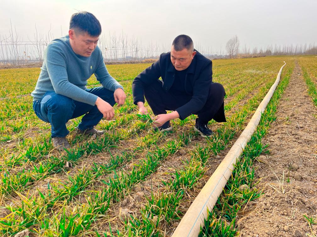山東省嘉祥縣金屯鎮(zhèn)賀李胡村種糧大戶(hù)張春杰(左一)正在和村干部一同查看麥苗長(zhǎng)勢(shì)。(受訪(fǎng)對(duì)象供圖)