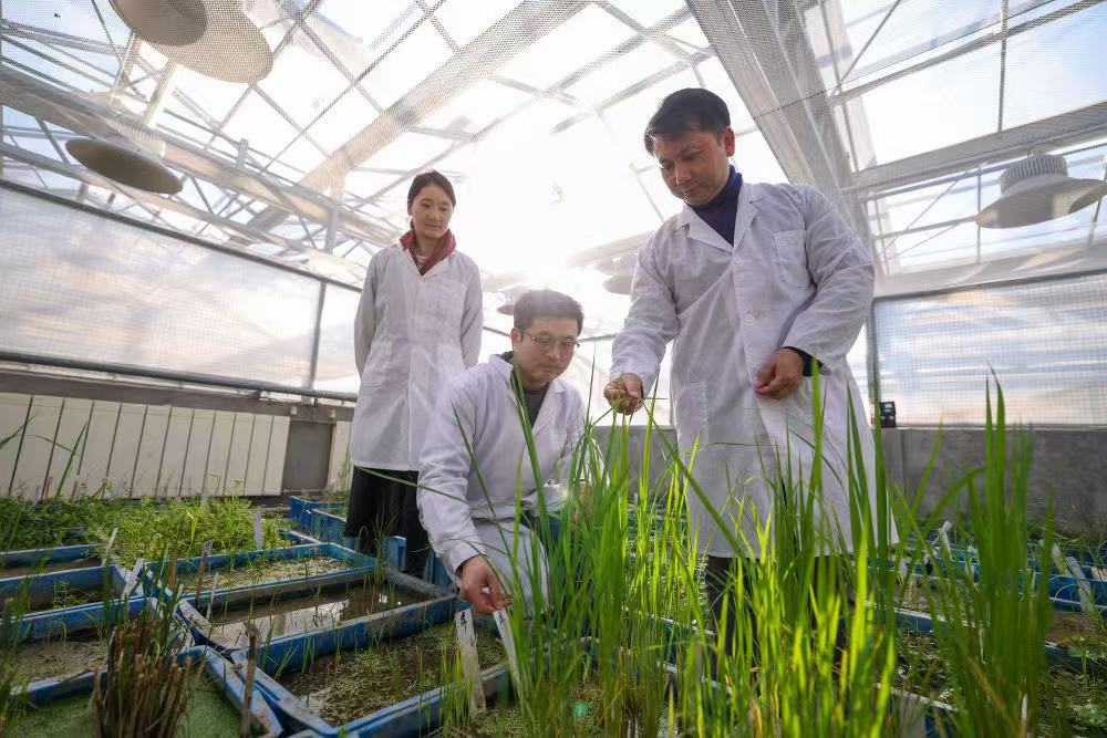 1月15日,中國(guó)水稻研究所研究員張?。ㄓ乙唬┰谘芯克鶞厥掖笈飪?nèi)查看水稻樣株的生長(zhǎng)情況。新華社記者江漢 攝
