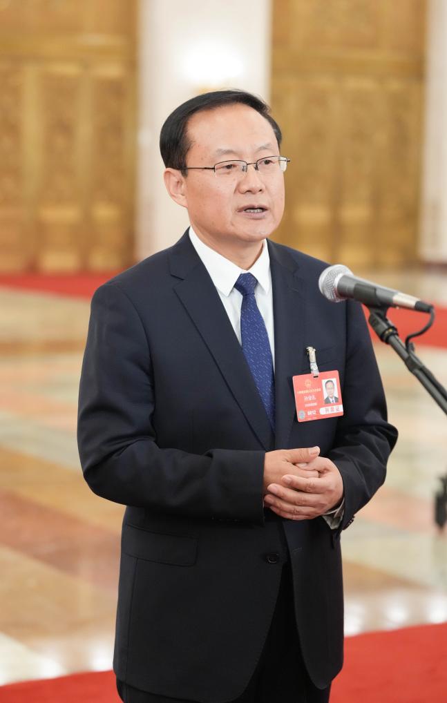 3月11日,第十四屆全國人民代表大會第三次會議第三場“部長通道”集中采訪活動在北京人民大會堂舉行。這是文化和旅游部部長孫業(yè)禮接受媒體采訪。新華社記者 鄭煥松 攝