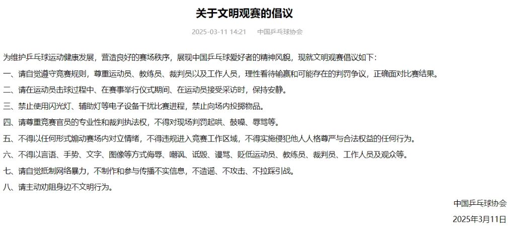 中國乒協(xié)表示,為維護(hù)乒乓球運(yùn)動健康發(fā)展,營造良好的賽場秩序,展現(xiàn)中國乒乓球愛好者的精神風(fēng)貌,特提出文明觀賽的倡議。