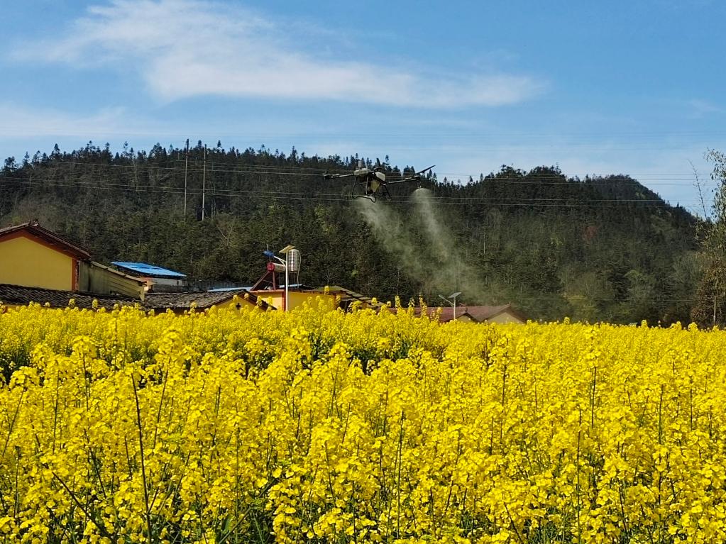 眼下,西部多地油菜進(jìn)入盛花期,做好田間管理尤為重要。在云南省馬關(guān)縣夾寒箐鎮(zhèn)上布高村,縣農(nóng)業(yè)農(nóng)村和科學(xué)技術(shù)局高級(jí)農(nóng)藝師李明兵和同事正操作著植保無人機(jī),沿著設(shè)定路線進(jìn)行飛防作業(yè)。無人機(jī)噴灑出霧狀農(nóng)藥,為1500余畝金色的油菜花海布下一道科技感十足的“防護(hù)簾”。