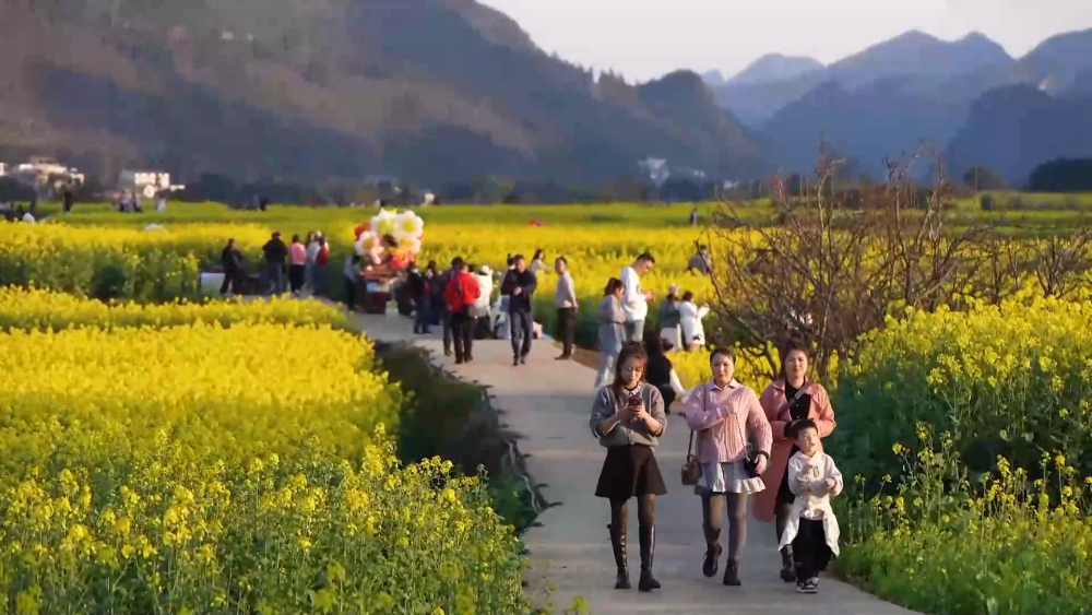 眼下,貴州省興義市萬峰林景區(qū)內(nèi)的6000多畝油菜花競相綻放,盛開的油菜花與峰林、田園、村莊、河流交相輝映,金色花海染盡鄉(xiāng)野,形成一幅美麗的山水田園畫,吸引了眾多省內(nèi)外游客前來觀賞打卡,欣賞春日美景。