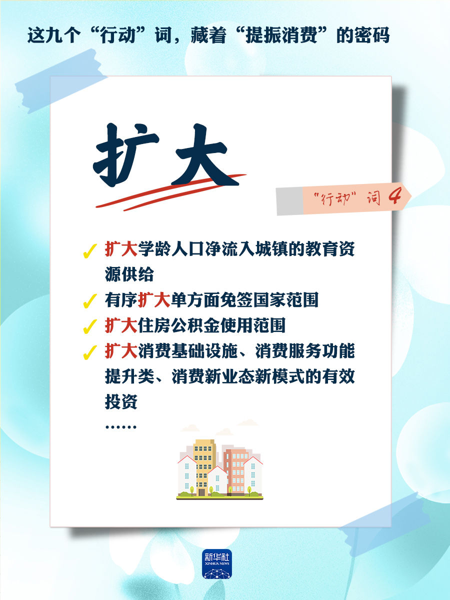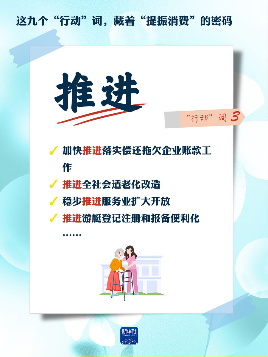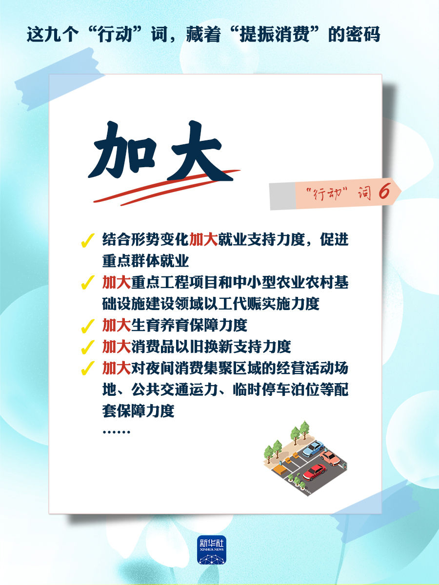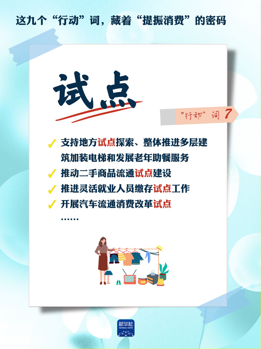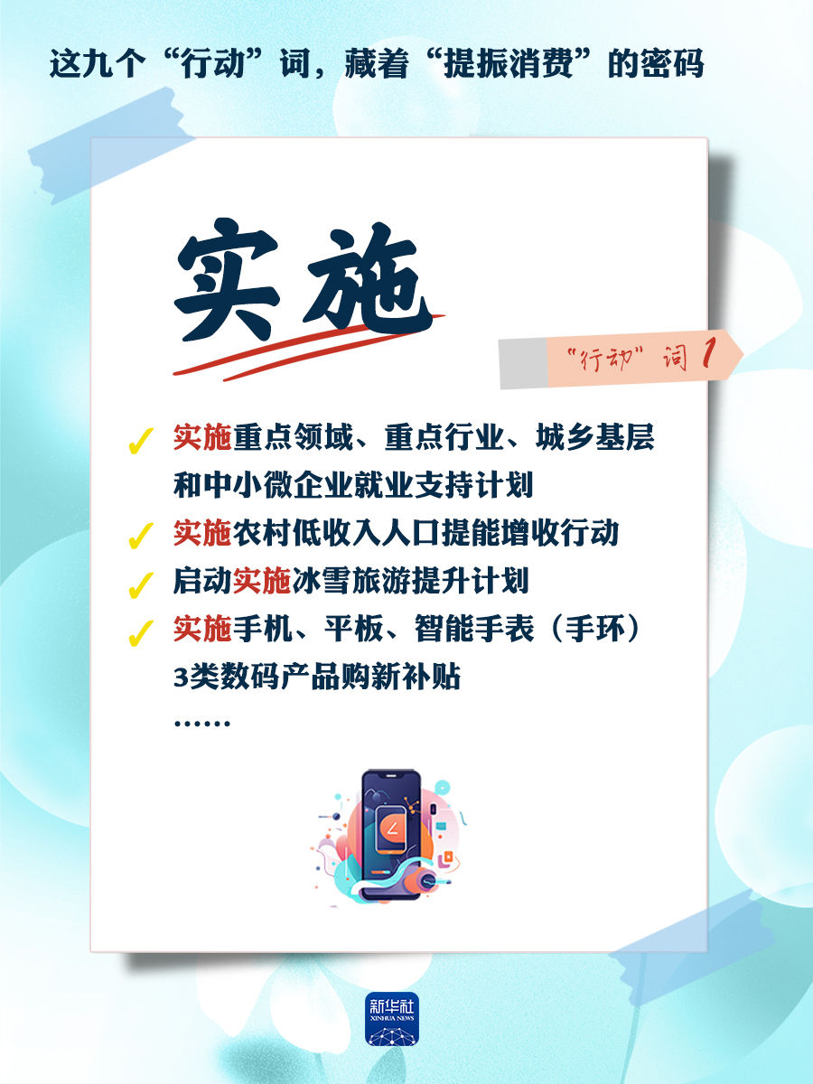 我們梳理出“方案”中使用頻率較高的九個(gè)“行動(dòng)”詞,從這些不同維度的“行動(dòng)”詞中,解讀“專(zhuān)項(xiàng)行動(dòng)”的豐富內(nèi)涵和政策“含金量”,看看哪些是立竿見(jiàn)影、吹糠見(jiàn)米的惠民行動(dòng)?哪些是需要加力擴(kuò)圍、加快補(bǔ)齊的消費(fèi)短板?還有哪些是需要有序推進(jìn)、以點(diǎn)帶面的消費(fèi)“新”點(diǎn)?