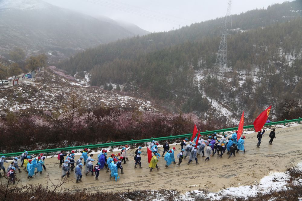 2021年,固原二中和弘文中學師生經(jīng)歷了迄今為止最艱難的一次徒步:一路上雨雪交加,很多學生的鞋子被雨水泡濕,不時陷入泥潭,相互協(xié)助才能拔出;有些路段處處泥水坑,只能一步一步趟水前行,鞋子不時“呲呲”發(fā)聲;回程時由于下山道路實在泥濘難行,不得不臨時改變線路,沿著山頂返回,拉長路途……