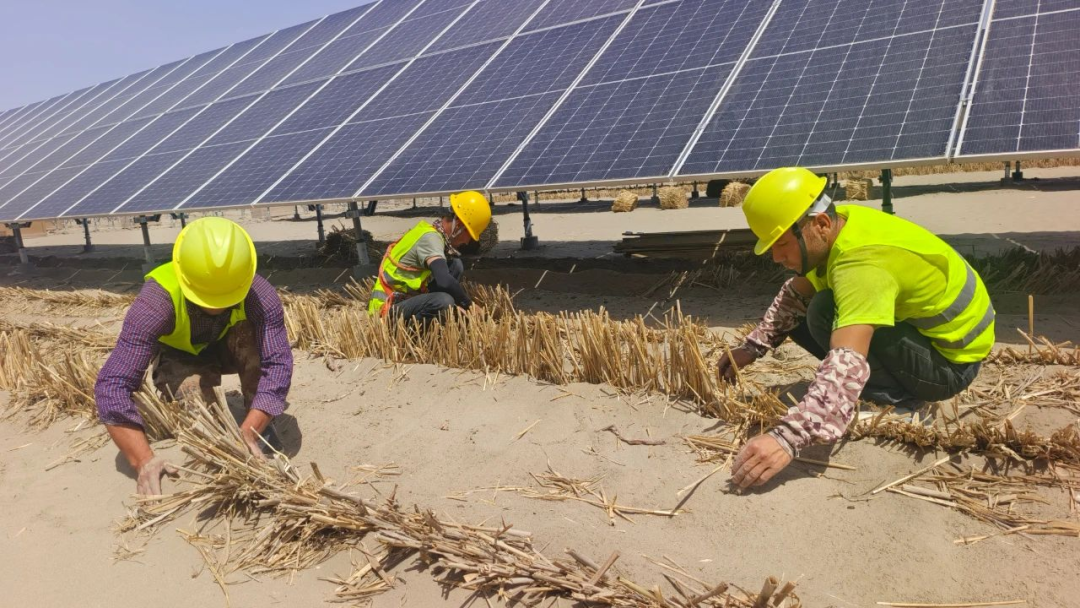 3月28日,在中國電建集團(tuán)新疆分公司新能源公司沙雅縣25萬千瓦光伏項目施工現(xiàn)場,工人們正緊張地安裝光伏板,周圍草方格的鋪設(shè)及梭梭的栽種也在同步開展當(dāng)中。該項目施工負(fù)責(zé)人郝澤權(quán)說,光伏發(fā)電助力機(jī)電井抽取沙漠地表百米以下的微咸水灌溉梭梭林,解決了長期以來沙漠植綠缺水難題,實現(xiàn)生態(tài)與經(jīng)濟(jì)的雙重收益。