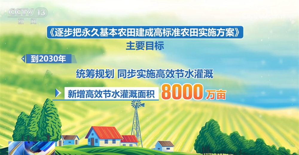 《實施方案》的主要目標是:到2030年,力爭累計建成高標準農(nóng)田13.5億畝,累計改造提升2.8億畝,統(tǒng)籌規(guī)劃、同步實施高效節(jié)水灌溉,新增高效節(jié)水灌溉面積8000萬畝;到2035年,力爭將具備條件的永久基本農(nóng)田全部建成高標準農(nóng)田,累計改造提升4.55億畝,新增高效節(jié)水灌溉面積1.3億畝。