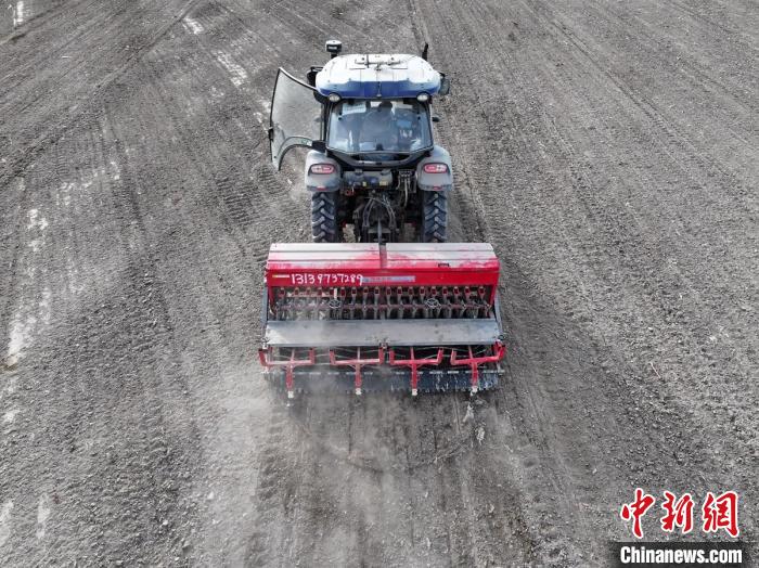 新疆巴音郭楞蒙古自治州庫爾勒市,搭載北斗導(dǎo)航系統(tǒng)的播種機(jī)在田間有序作業(yè)。確·胡熱 攝