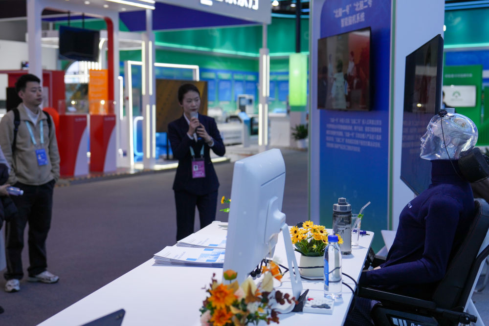 在中關(guān)村展示中心常設(shè)展內(nèi),參觀者在聽取“北腦一號(hào)”“北腦二號(hào)”智能腦機(jī)系統(tǒng)介紹。新華社記者 鞠煥宗 攝