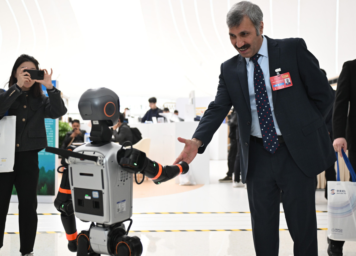 3月27日,與會(huì)嘉賓與一款加速T1機(jī)器人握手。(圖片來源:新華社)