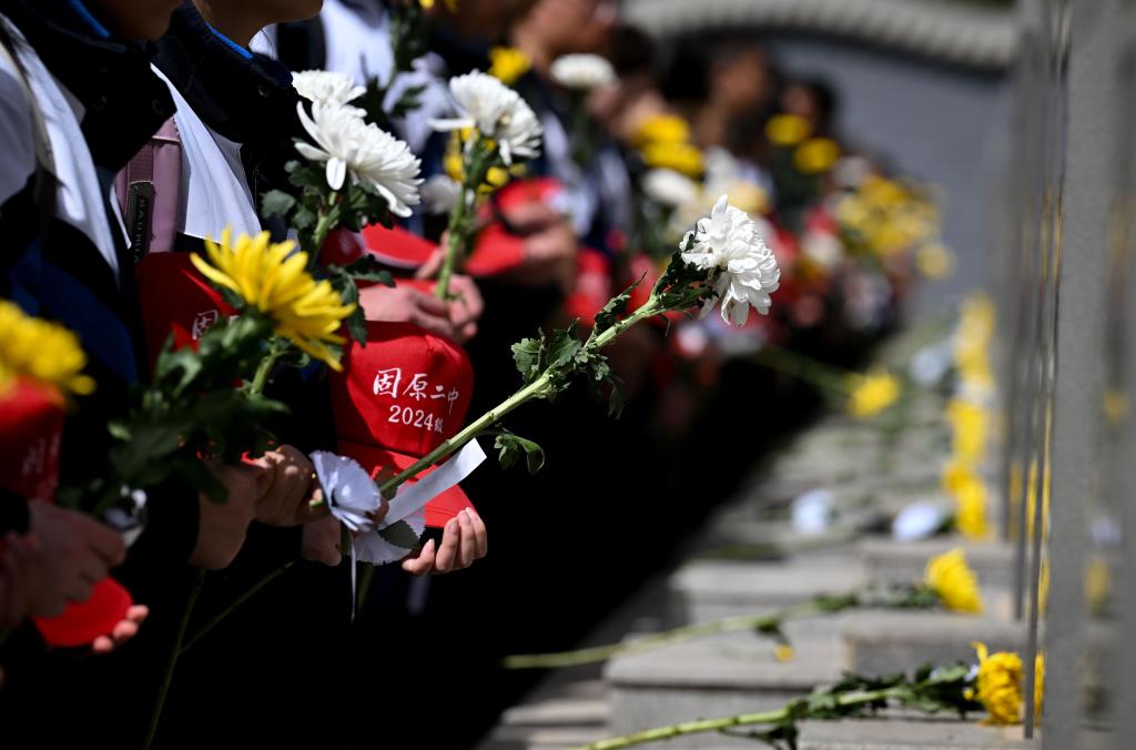 4月3日,在任山河烈士陵園,固原二中學(xué)生向烈士墓碑獻(xiàn)花。