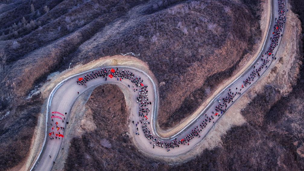 4月3日,參加徒步祭英烈活動(dòng)的師生在翻越黃峁山(無(wú)人機(jī)照片)。