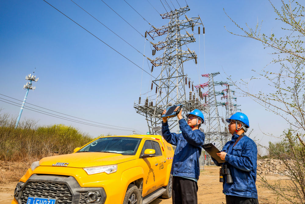 4月10日,國網(wǎng)北京昌平供電公司員工在陽坊鎮(zhèn)溫南路對重點(diǎn)線路開展特巡。(國網(wǎng)北京分公司供圖)
