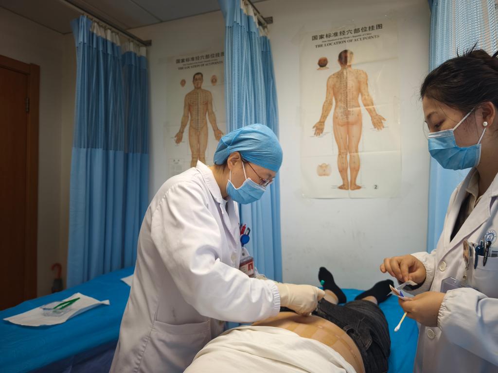 安徽省針灸醫(yī)院內(nèi)分泌科主任醫(yī)師費(fèi)愛(ài)華(左)為一位肥胖者開(kāi)展埋線治療(4月7日攝)。新華社記者 郭晨 攝