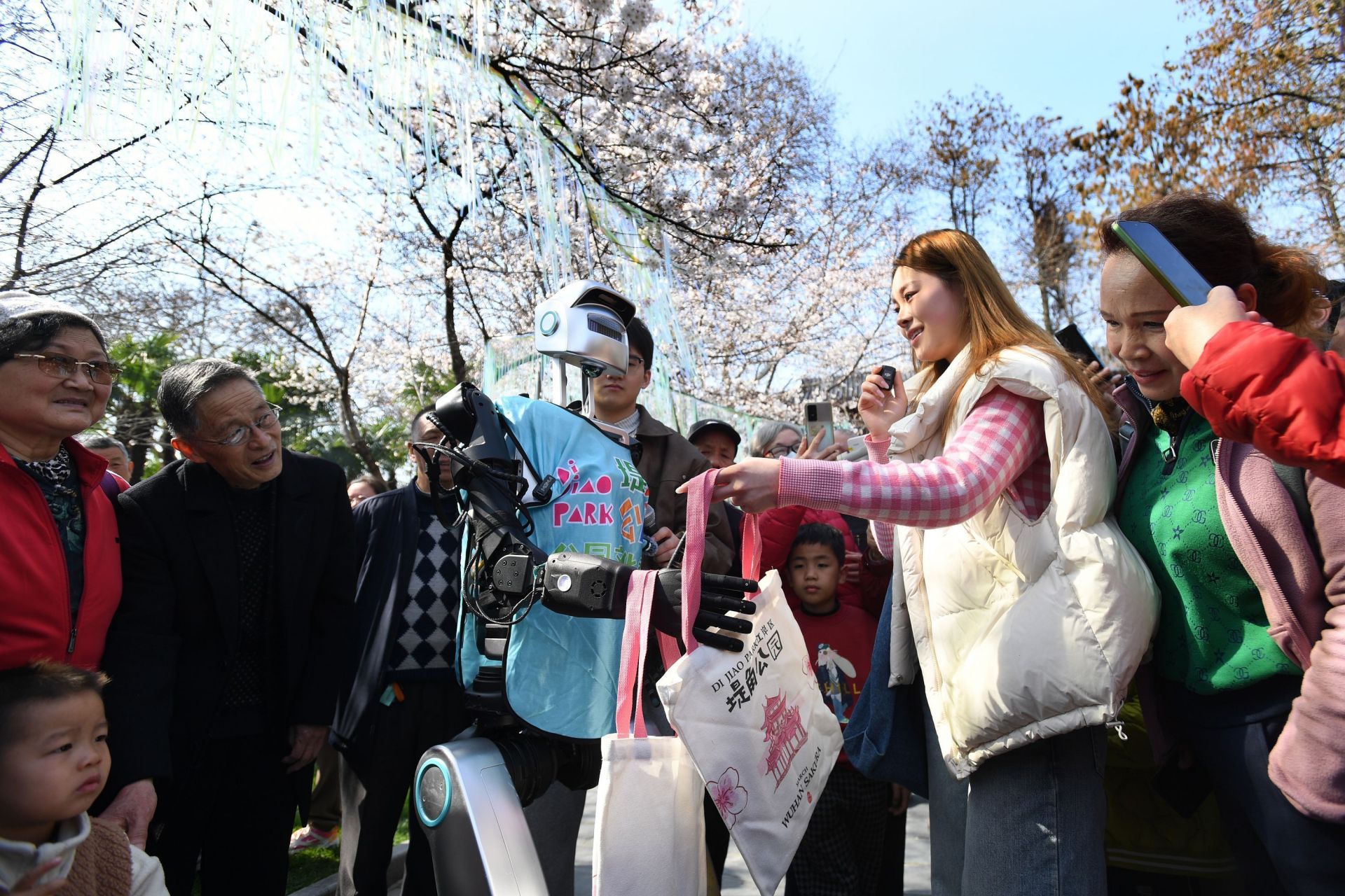 3月19日,堤角公園,人形機(jī)器人“小天”穿過(guò)櫻花云廊,精準(zhǔn)避開(kāi)奔跑的孩童。