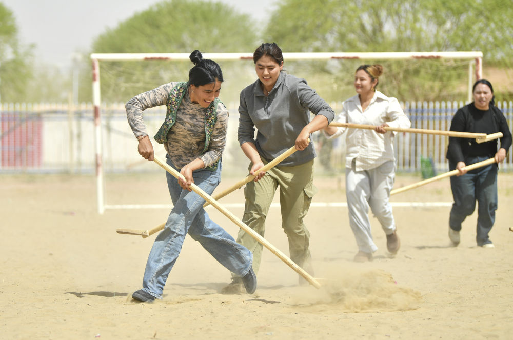 達里雅布依鄉(xiāng)女子麥熱球隊的訓練場地,就是一片被胡楊、紅柳包圍著的沙地操場。麥熱球類似曲棍球,是一種在新疆和田地區(qū)廣泛流行的古老運動。這項群眾性運動并沒有過于嚴格的規(guī)則,一片空地,三五好友,興之所起,即可揮桿。2021年,麥熱球被正式列入國家級非物質(zhì)文化遺產(chǎn)代表性項目名錄。