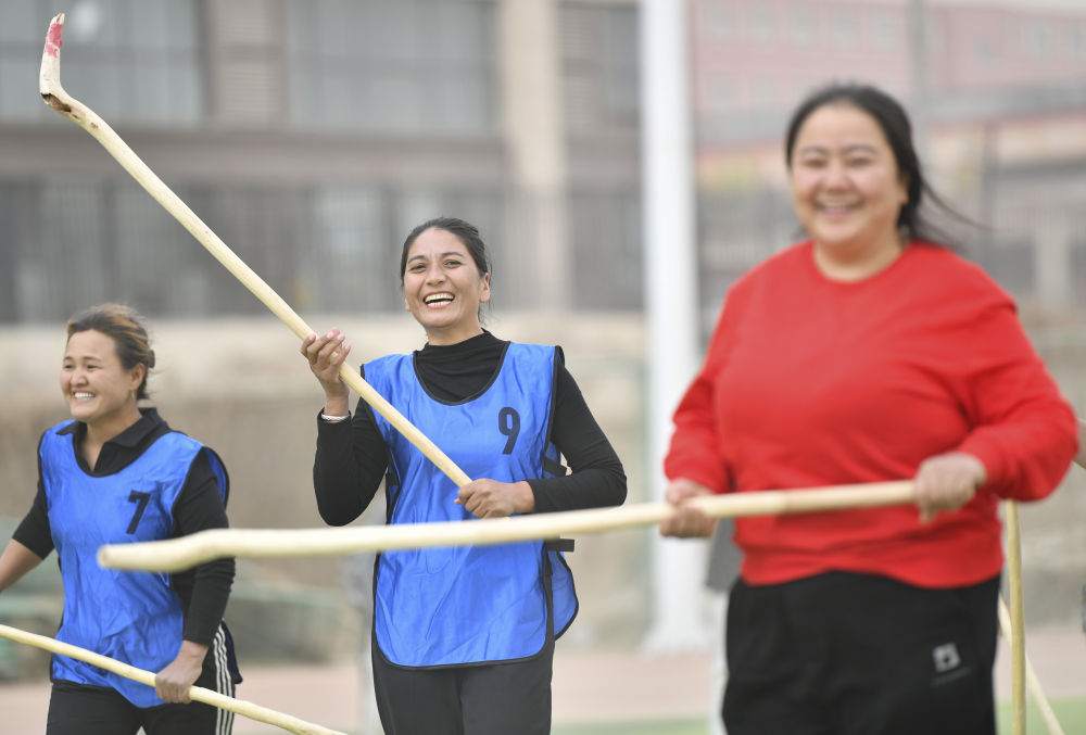 在奔跑擊球中,阿依古麗和隊友也感受到這項古老集體運動的魅力,她們在場上沒有明確的位置之分,但又默契地熟知各自的特點?!鞍⒁拦披愑屑で椤薄芭撂峁披惖乃俣瓤臁薄巴履嵘澈沟牧獯蟆薄鞍髂竞箵羟驕省薄恢皇躯湡崆?,她們作為村里的文體骨干,還常出現(xiàn)在籃球、拔河、踢毽子等比賽中,成為一道靚麗風景線。