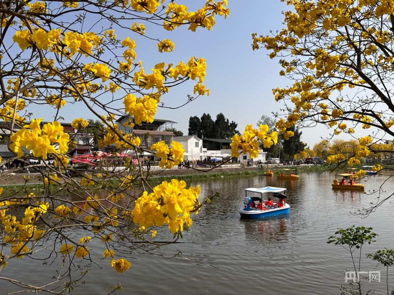 四月芳菲盛,踏青正當(dāng)時。近日,四川省簡陽市東麓花溪的千畝黃花風(fēng)鈴木迎來盛花期,金黃花海不僅吸引八方游客紛至沓來,更催生出多元消費新場景,讓“鮮花經(jīng)濟(jì)”綻放出獨特魅力。