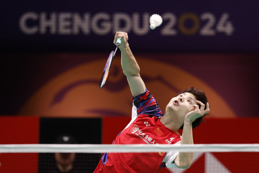 2024年5月5日,在四川成都舉行的2024年湯姆斯杯羽毛球團(tuán)體賽決賽中,中國隊(duì)選手石宇奇在男子單打比賽中回球。新華社記者 沈伯韓 攝