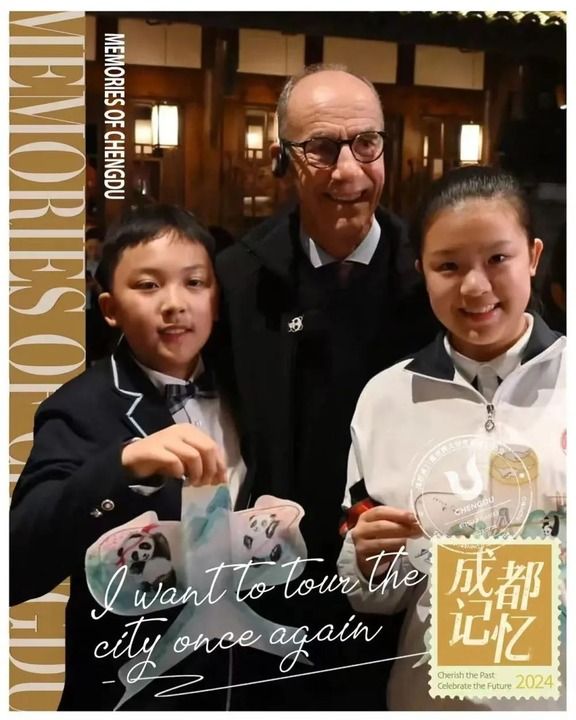國際大體聯(lián)主席艾德收到的成都記憶定制文創(chuàng)風(fēng)箏。圖為他與成都中小學(xué)生的合影。新華社發(fā)