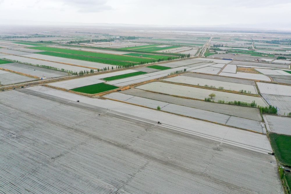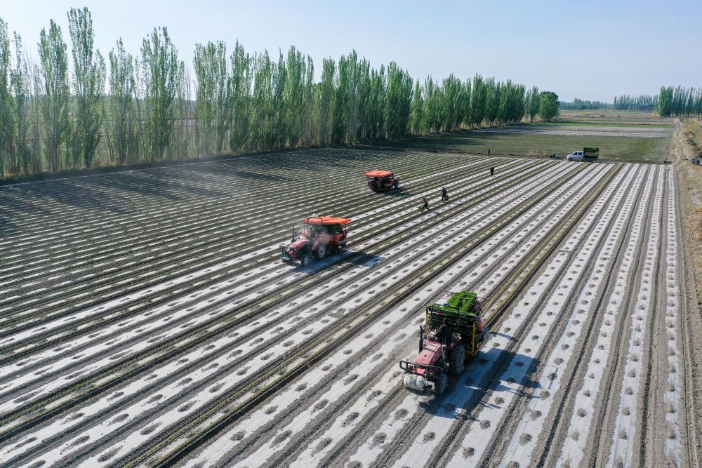 在新疆巴音郭楞蒙古自治州焉耆回族自治縣四十里城子鎮(zhèn),農(nóng)戶操作移栽機(jī)在農(nóng)田里移栽番茄苗(4月26日攝,無(wú)人機(jī)照片)。新華社記者丁磊 攝