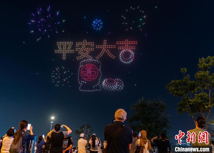 香港旅游發(fā)展局5月1日晚以天后誕、譚公誕及長洲太平清醮三大傳統(tǒng)節(jié)慶為主題,在灣仔海濱舉辦無人機(jī)表演。香港特色民俗“搶包山”比賽場景在夜空出現(xiàn),“搶包山”搶上了天,引得圍觀人群贊嘆。