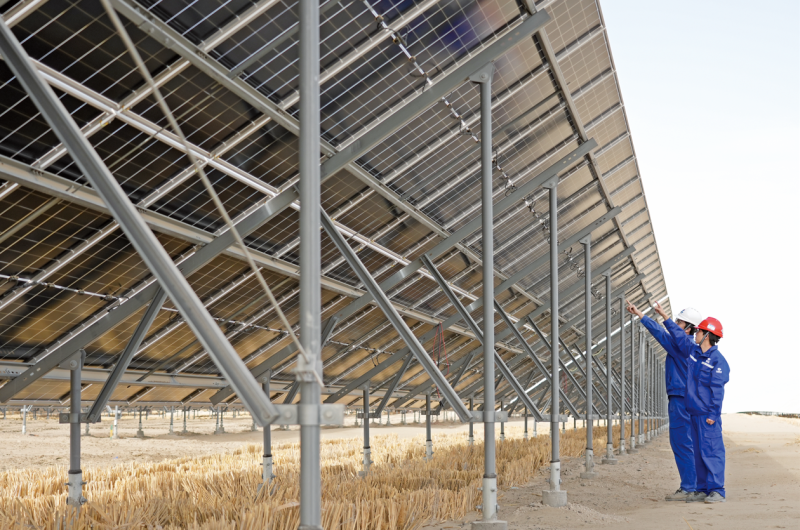 中電建沙雅縣25萬千瓦光伏產(chǎn)業(yè)園區(qū)技術(shù)人員在檢查光伏板建設(shè)情況。朱曉飛/攝