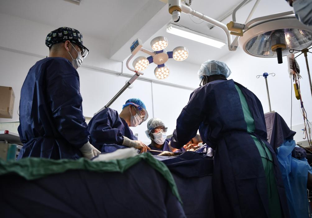 2025年4月29日,在位于幾內(nèi)亞首都科納克里的中幾友好醫(yī)院,中方醫(yī)生與當?shù)蒯t(yī)生為患者做手術(shù)。新華社記者韓旭攝