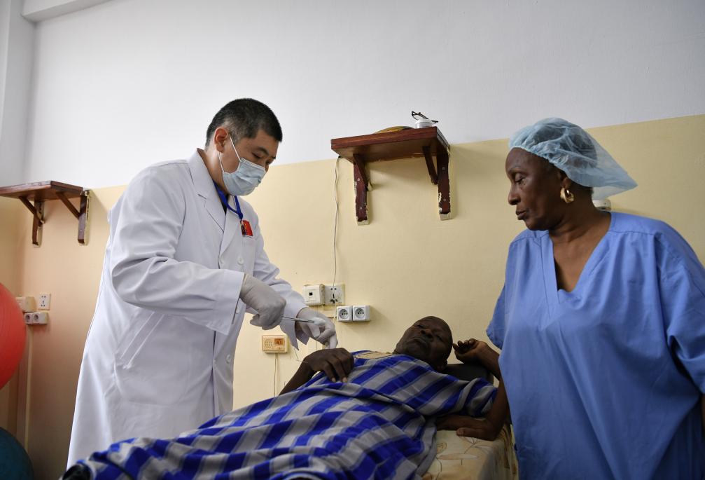 2025年4月29日,在位于幾內(nèi)亞首都科納克里的中幾友好醫(yī)院,中國醫(yī)療隊醫(yī)生劉路遙為患者做針灸治療。新華社記者韓旭攝