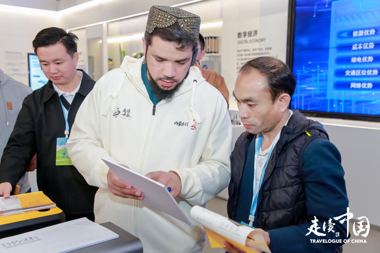 《喀布爾時報》總編尼克馬爾(中)在烏蘭察布(京蒙)人才科創(chuàng)園展廳仔細(xì)了解相關(guān)介紹
