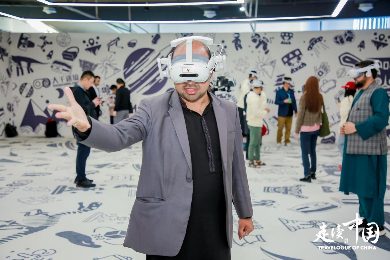 巴基斯坦記者賽義德·奧恩·穆罕默德佩戴VR設(shè)備體驗互動場景