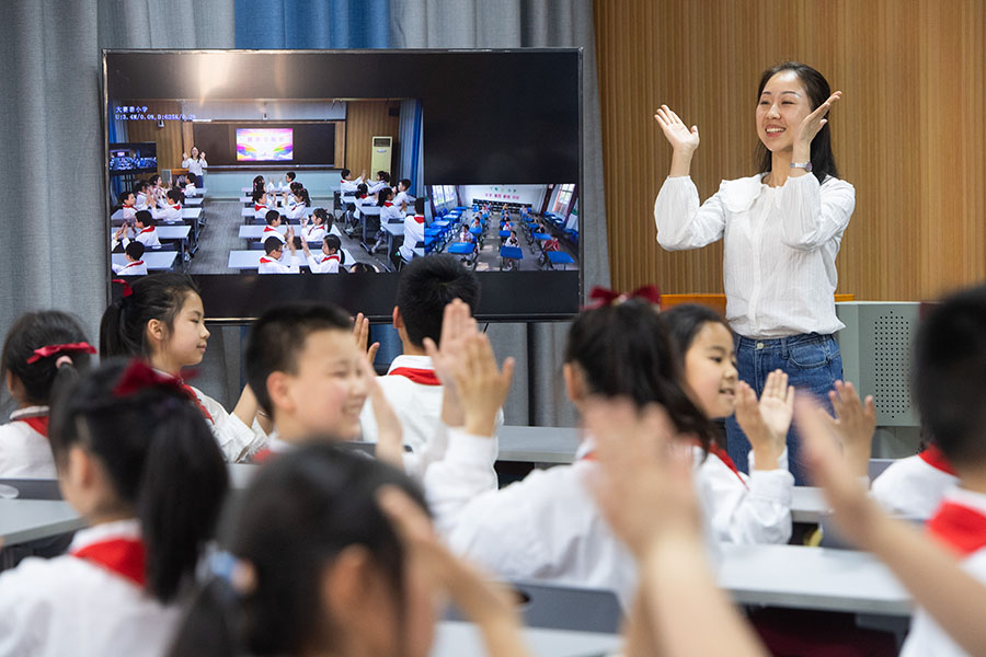 2022年5月16日,在湖北省荊州市沙市大賽巷小學(xué),學(xué)生通過(guò)“空中課堂”與偏遠(yuǎn)鄉(xiāng)鎮(zhèn)的丫角小學(xué)一起進(jìn)行韻律操活動(dòng)。 新華社記者 肖藝九 攝