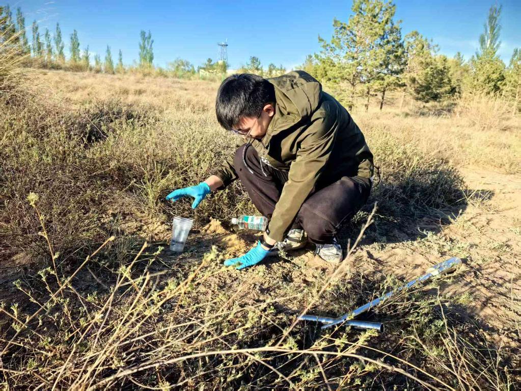 北京林業(yè)大學博士生農(nóng)皓鈞在野外做荒漠土壤動物研究。新華社記者 馬麗娟 攝