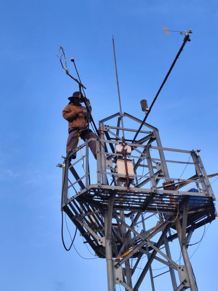 北京林業(yè)大學博士生梁琨在檢修維護通量塔。(受訪者供圖)