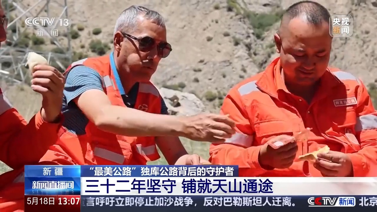 下午兩點多,亞克甫招呼大家停下來吃午飯。這幾天,亞克甫和同事們要搶在獨庫公路通車之前,把冰封了一個冬天的道路養(yǎng)護好。他們經(jīng)常沒時間回到養(yǎng)護站休整,午飯也只能在路邊對付一下。