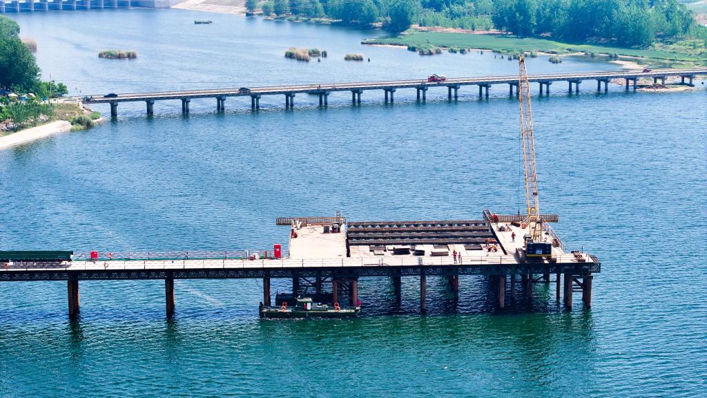 國(guó)家重點(diǎn)項(xiàng)目濰(坊)宿(遷)高速鐵路項(xiàng)目承建方正搶抓工期與節(jié)點(diǎn),穩(wěn)步推進(jìn)標(biāo)段施工。4月30日,在濰宿高鐵山東郯城段,中鐵上海局的工作人員在進(jìn)行沭河特大橋施工(無(wú)人機(jī)照片)。新華社記者 郭緒雷 攝