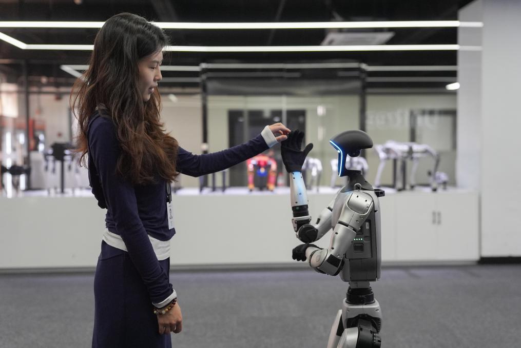 4月23日,在知名機(jī)器人公司杭州宇樹科技展廳內(nèi),宇樹人形機(jī)器人G1展示模仿動(dòng)漫角色奧特曼的“光波”動(dòng)作。 新華社記者 黃宗治 攝
