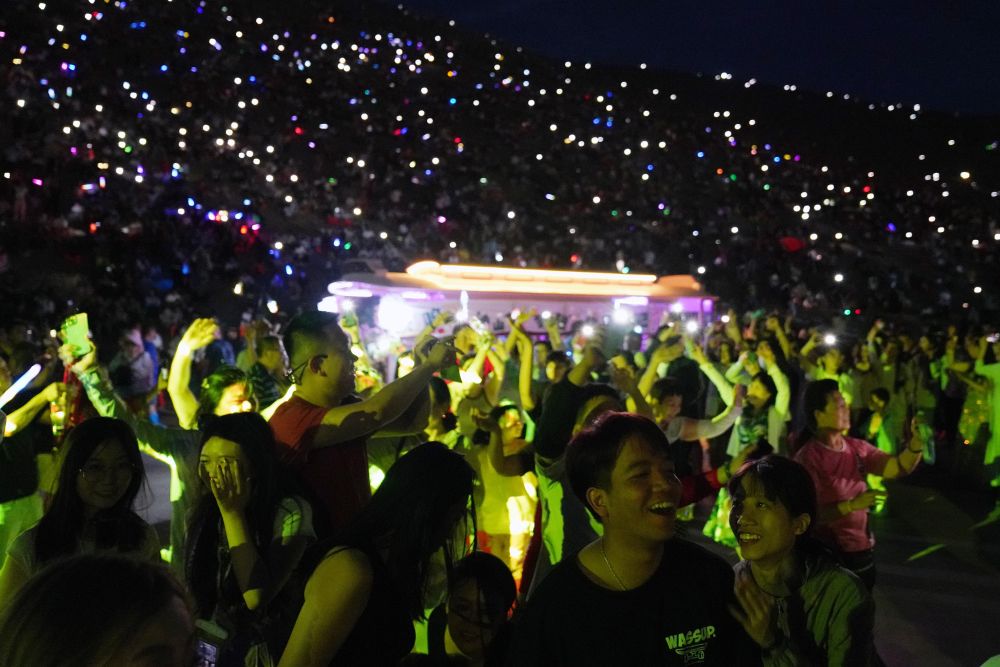 游客在敦煌鳴沙山月牙泉景區(qū)參加萬(wàn)人星空演唱會(huì)。新華社記者 馬寧 攝