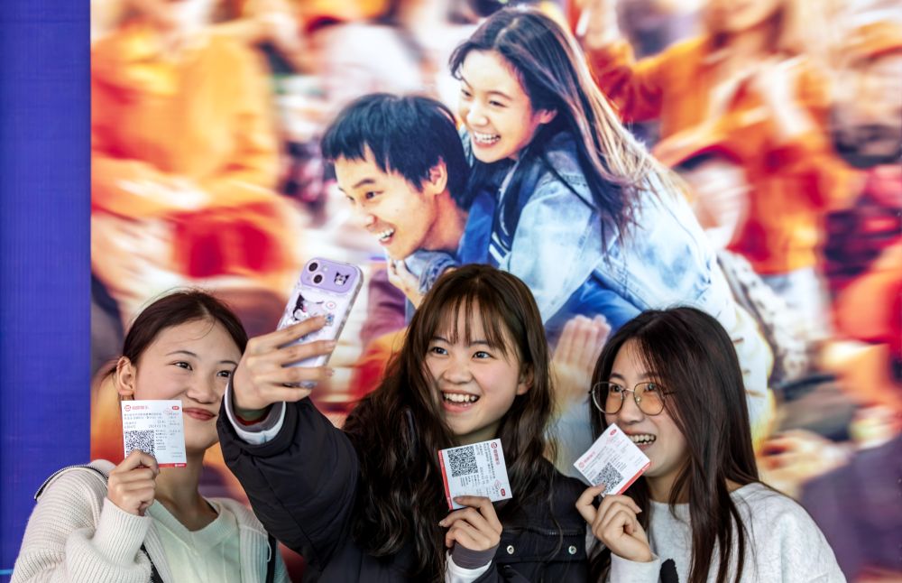 觀眾手持電影票在貴州省黔西市橫店電影城電影海報(bào)前留影。新華社發(fā)(范暉 攝)