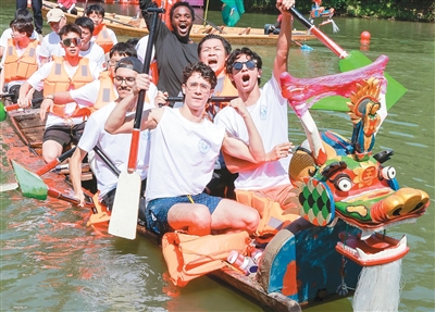 去年,我參加了由杭州余杭區(qū)五常街道組織的龍舟體驗(yàn)營,親身感受競渡帶來的“速度與激情”。我和同校好友組成隊(duì)伍,伴著耳邊觀眾的熱情歡呼揮槳出發(fā),濺起的水花在河道綻放。握槳、入水、拉水、出水、回槳……隨著龍舟劃至終點(diǎn),我們揮舞校旗、舉槳?dú)g呼。在龍舟運(yùn)動中,我感受到了奮斗和團(tuán)結(jié)的力量——不同膚色的人們在同一條水道上并肩奮進(jìn),這不正是“同舟共濟(jì)”的東方智慧嗎!