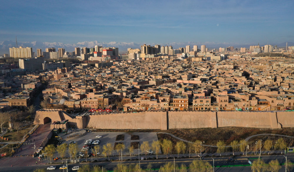 清晨,灑滿陽(yáng)光的喀什古城(2023年3月10日,無人機(jī)拍攝)。新華社記者 李響 攝