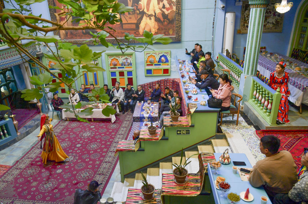 游客在新疆喀什古城景區(qū)的一家民宿內(nèi)欣賞歌舞表演(2024年4月29日攝)。新華社記者 王菲 攝