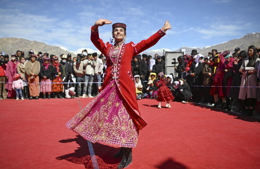 在新疆塔什庫(kù)爾干塔吉克自治縣提孜那甫鄉(xiāng)賽馬場(chǎng),參與非遺展演的村民在跳舞(2025年3月23日攝)。新華社記者 胡虎虎 攝