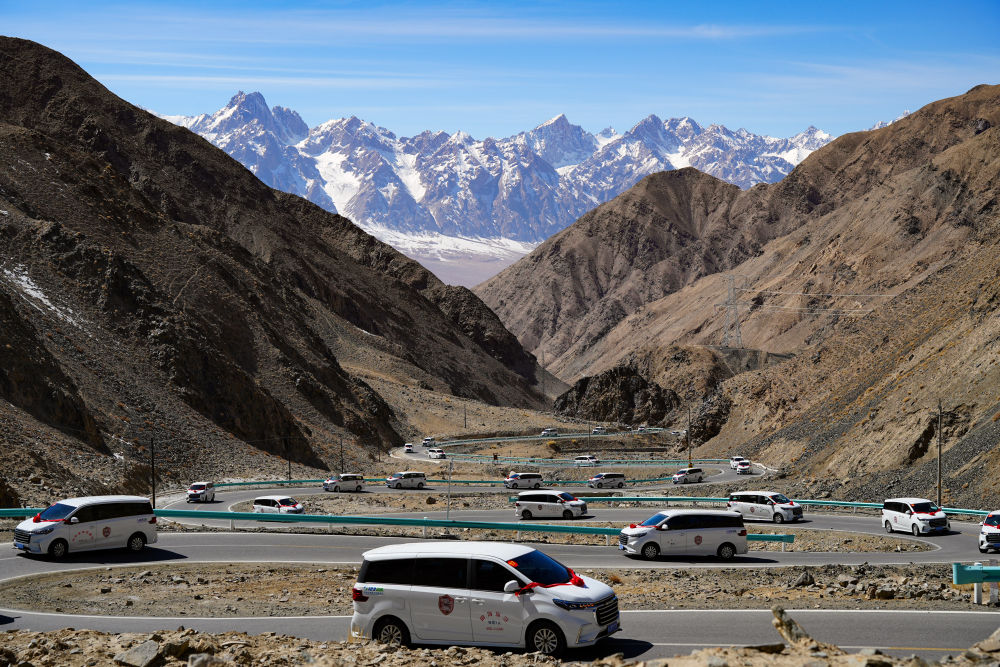 在新疆塔什庫(kù)爾干塔吉克自治縣,參加“盤龍古道”恢復(fù)通車儀式的車隊(duì)在行進(jìn)中(2025年3月22日攝)。新華社記者 徐宏巖 攝