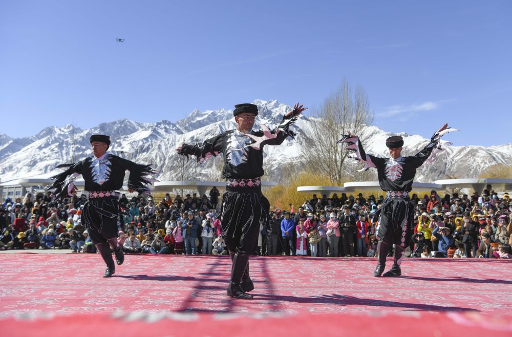 在新疆塔什庫(kù)爾干塔吉克自治縣“彩云人家”民俗村,演員為觀眾表演國(guó)家級(jí)非物質(zhì)文化遺產(chǎn)——鷹舞(2025年3月22日攝)。新華社記者 胡虎虎 攝